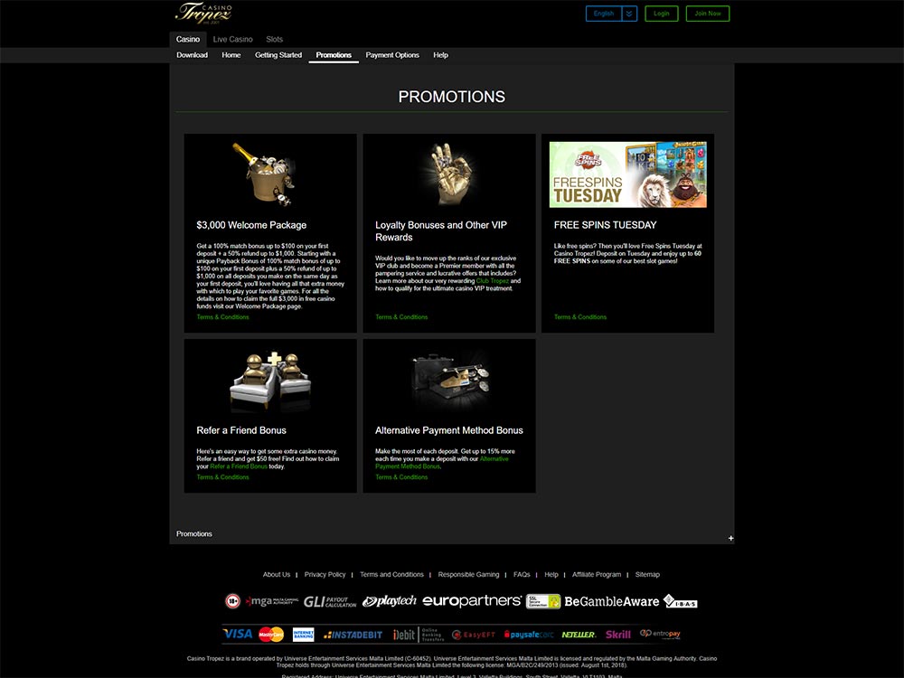 This website is generous with bonuses particularly welcome bonus and hence, anyone registering new with Tropez is eligible for all the sub-bonuses and refunds without any coupons or promotions code. The payment offers also goes by the same.